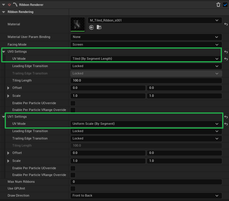 머터리얼에서 Tile 텍스쳐와 알파의 UV 채널을 따로 주면 Ribbon Renderer 에서 타일링 옵션을 다르게 줄 수 있다
