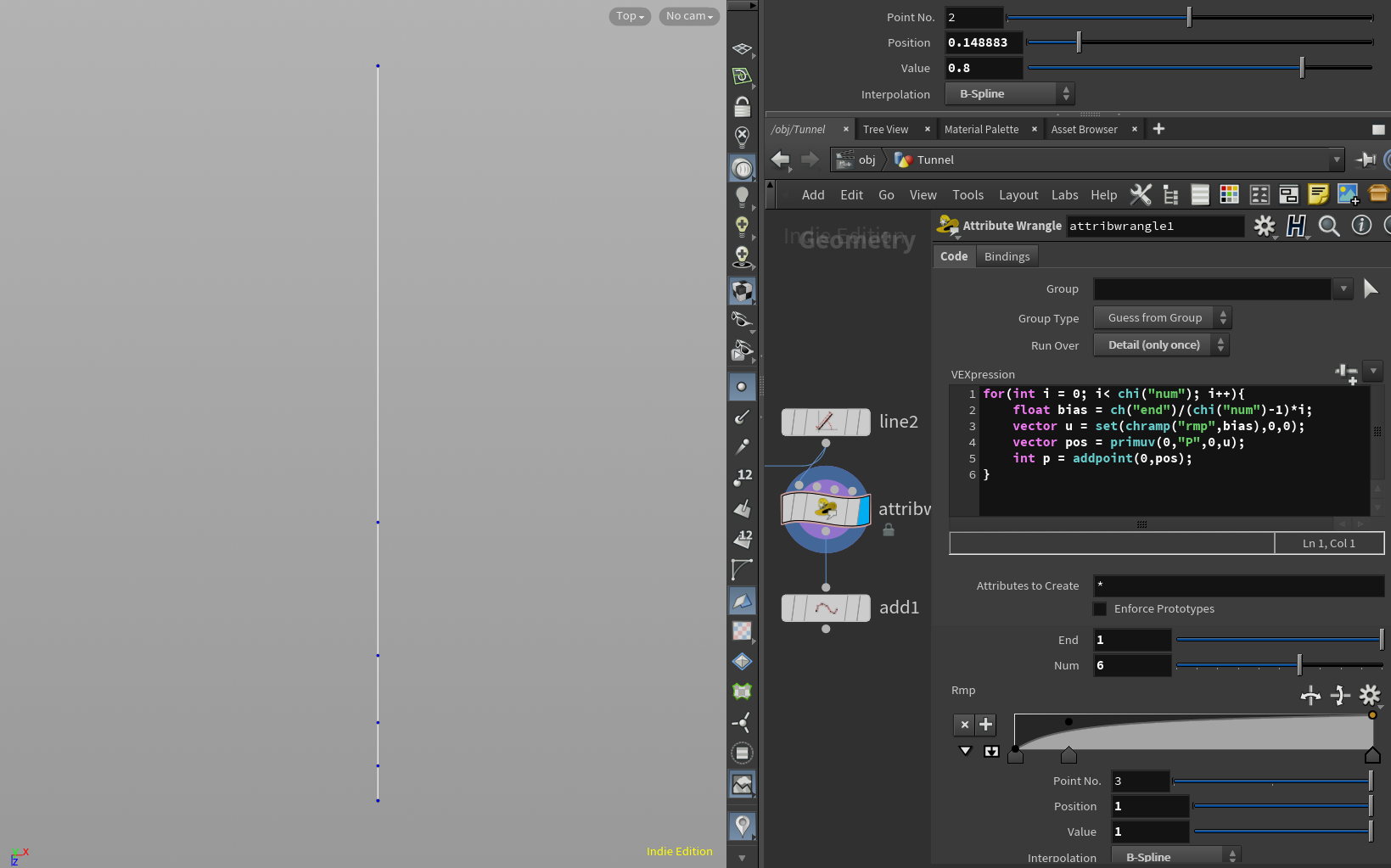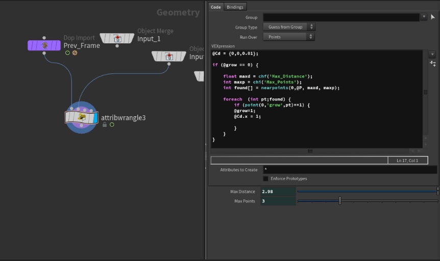 Dot Product 이용해서 필요없는 포인트들 지워주기 초록색 부분을 제외한 뒤쪽을 쥐워줄 것이다 우선 앞뒤로 포인트 두개만 남겨준다 각각 포인트 번호를 이용해서, 두 값의 차벡터를 nor_dir 이라는 변수로 지정해주고, 원본 지오메트리의 노멀과 dot product 값을 구한다 0.5 의 값을 가지는 부분은 직각이 되는곳, 뒤쪽은 (-)값이므로, Dot product 값이 0.5 이하인 포인트들은 삭제했다 Houdini/Houdini 2023.03.22