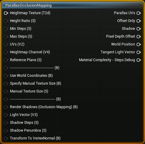 시차 맵핑, 안쪽 혹은 바깥쪽으로 텍스쳐를 여러겹 쌓아서 입체적으로 보이도록 해준다 Texture Sample, Texure Object • Heightmap Texture : 흑백으로 이루어진 텍스처를 사용한다, 검은부분이 들어가는 부분 • Height Ratio : 깊이값의 정도 Min, Max Step : 몇번 층을 쌓을건지 결정한다, Max Step이 높을수록 깔끔한 형태가 나오지만, instruction이 많이 올라간다
